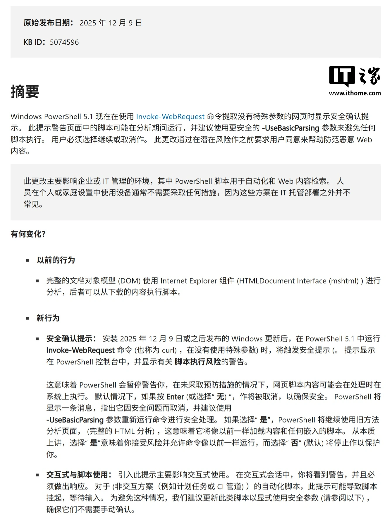 鉴于 PowerShell 5.1 是 Windows 10 的默认版本,此漏洞严重威胁通过命令行处理 Web 内容的用户。微软为彻底解决上述风险,调整了 Invoke-WebRequest 命令的执行逻辑。